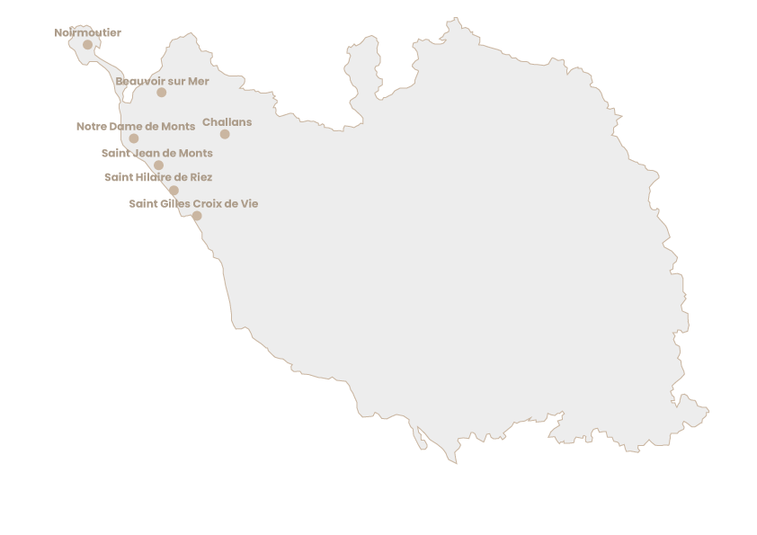 Noirmoutier, Saint-Jean-de-Monts, Challans, Saint-Gilles-Croix-de-Vie, Bouin, Beauvoir-sur-Mer, et les environs.